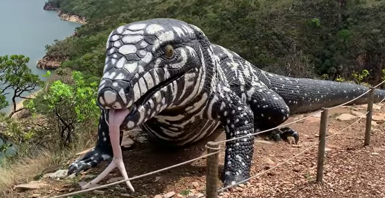 Hoje, o passeio é marcado pelo silêncio e respeito à natureza — sem música alta, sem gritos, apenas o som do vento e da água, tornando o lugar um parque de contemplação e harmonia. Durante o percurso, é possível encontrar estátuas dos animais típicos da região, como o tamanduá-bandeira, o lobo-guará, o pato-mergulhão, o tatu, o lagarto teiú, além de diversas aves e répteis — uma linda homenagem aos verdadeiros habitantes do parque, muitos deles de hábitos noturnos. E claro, o Garbosa News não poderia deixar de registrar tudo isso de pertinho! Aqui ao fundo, dá pra ver uma visitante se aventurando na tirolesa, cruzando o cânion nesse visual espetacular. Quem sabe a gente também encara essa travessia, hein? Fica o convite pra você vir conhecer o Pauá Parque, viver essa conexão com a natureza e se encantar com tudo o que Capitólio tem a oferecer.