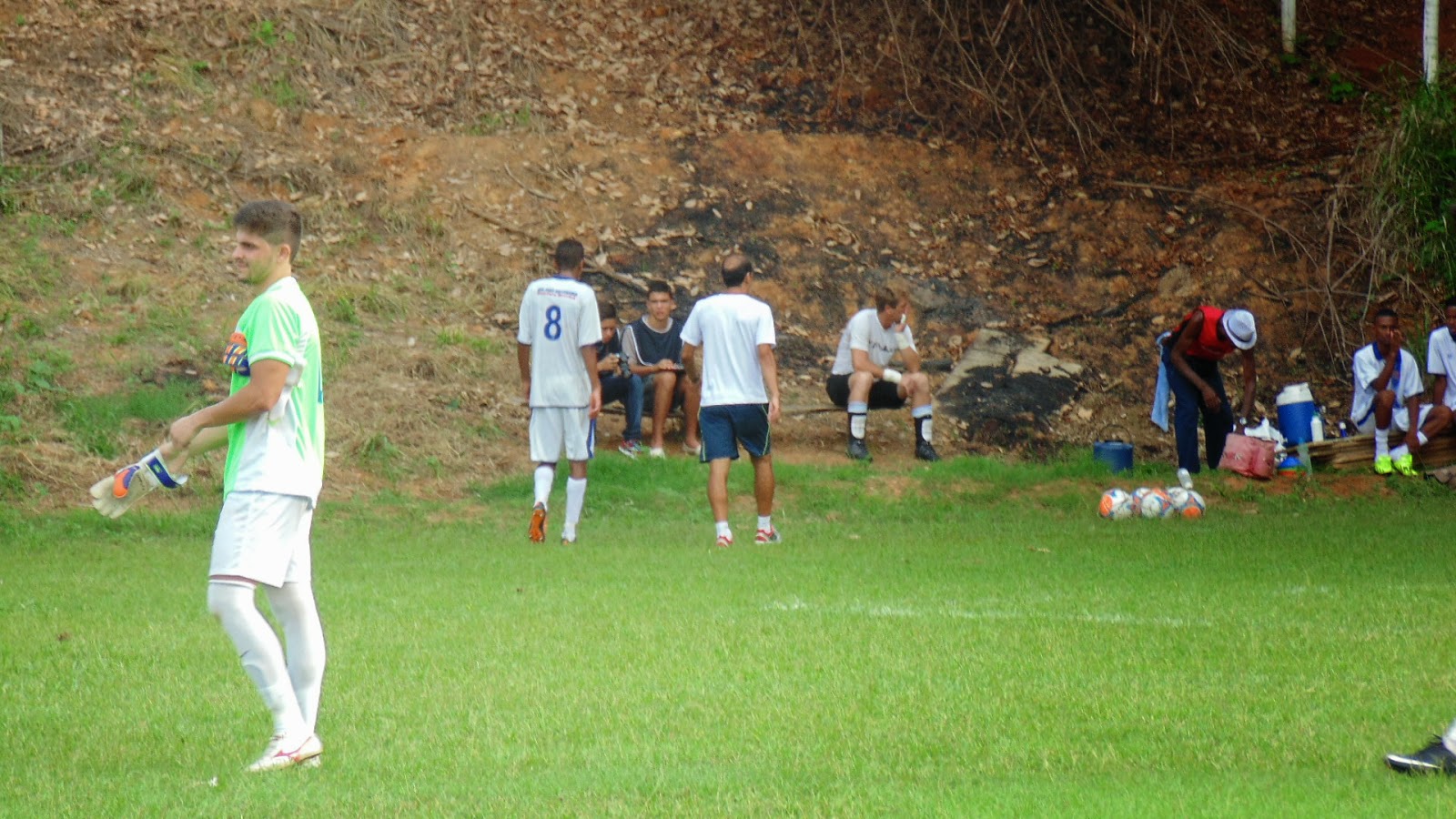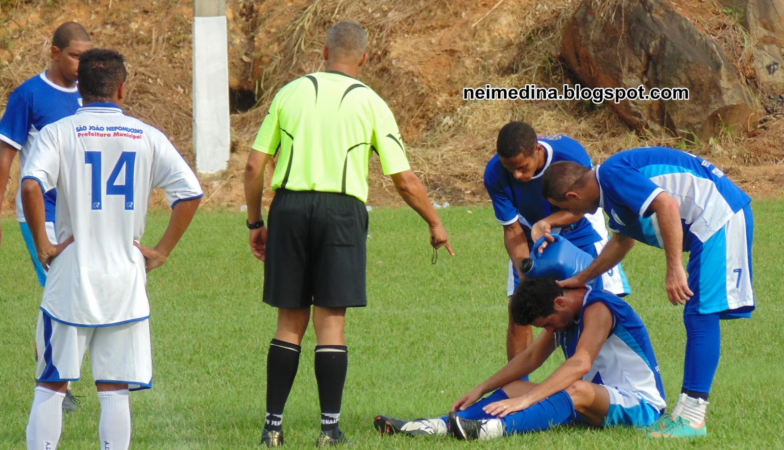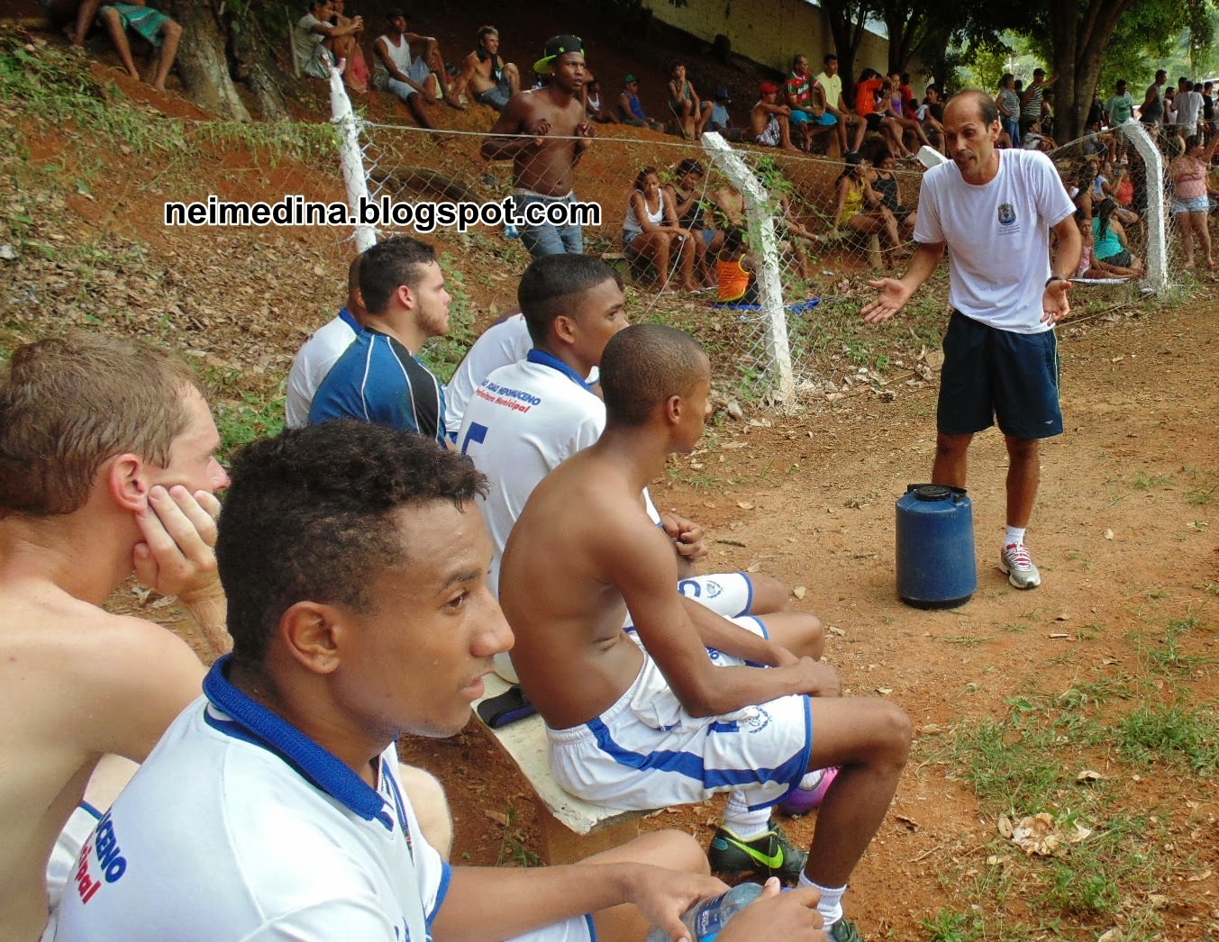 Freitas(camisa verde) junto com o torcedor de Itamarati. O árbitro e segurança nas horas vagas, sorri.