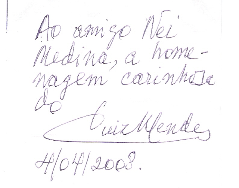 Com a ajuda de Marcos Eduardo Neves, consegui um autógrafo de Luiz Mendes quando de sua passagem por Barbacena, onde participou da “Semana da loucura”. Evento Cultural organizado pela Prefeitura daquela cidade.