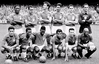 Seleção Campeã Mundial em 1958, na Suécia. Em pé: Djalma Santos, Zito, Bellini, Nílton Santos, Orlando e Gilmar. Agachados: Garrincha, Didi, Pelé, Vavá e Zagallo. Ao lado, o massagista Mario Américo.